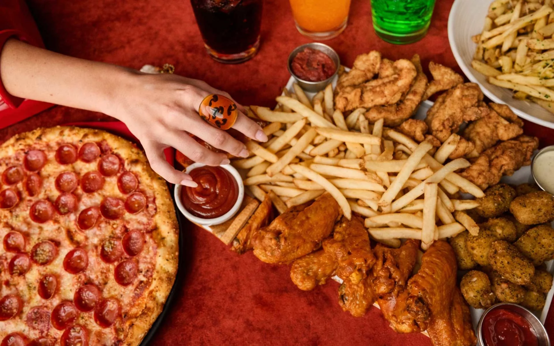 Pizza, wings, sliders, and fries